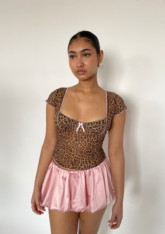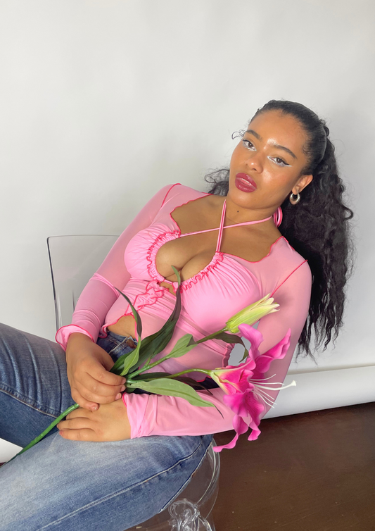 Fuller Bust Long Sleeve Mesh Fantasy Top In Pink With Lettuce Edge