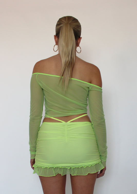 Mini-jupe vert lime, bretelles réglables à la taille et détails volants